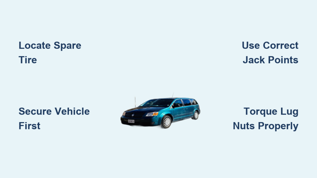 Improper lifting technique causes most tire-changing injuries. The Caravan’s weight distribution requires specific jack positioning that differs from most passenger vehicles.