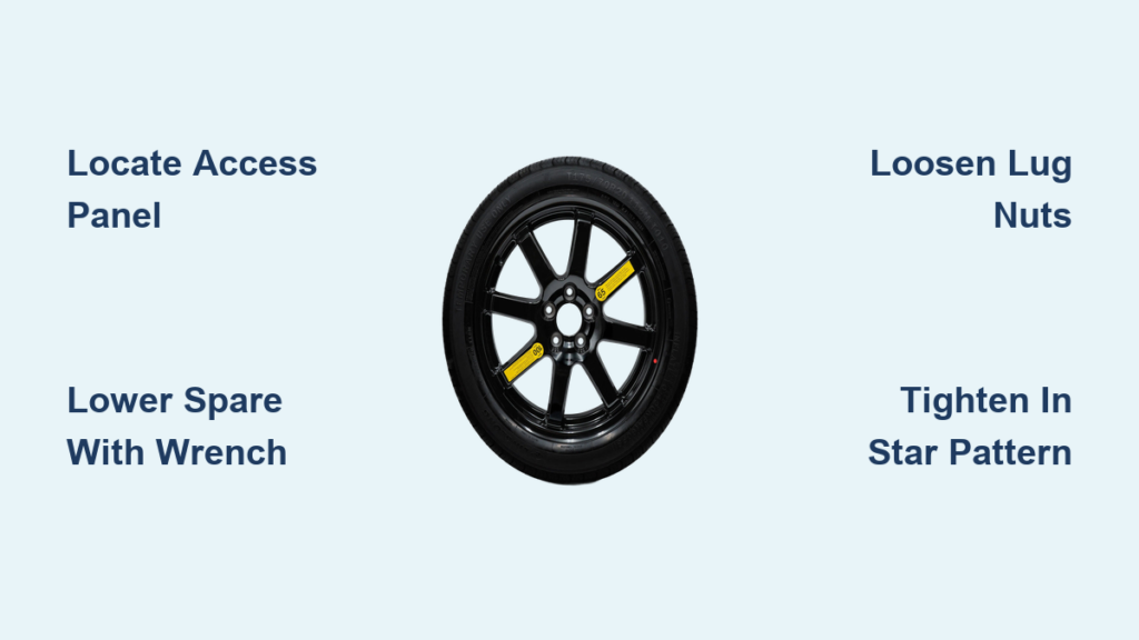 Open your trunk and examine the floor near the rear seats to find the rectangular access panel clearly marked for spare tire identification. This panel typically features a small handle or indentation designed for easy lifting. Grip the handle firmly and lift the panel upward to expose the spare tire compartment below. Inside, you’ll immediately see the large securing bolt in the center, the winch mechanism, and your spare tire positioned above. If you can’t locate the panel, check near the spare tire storage area for any carpet covering that might need removal first.