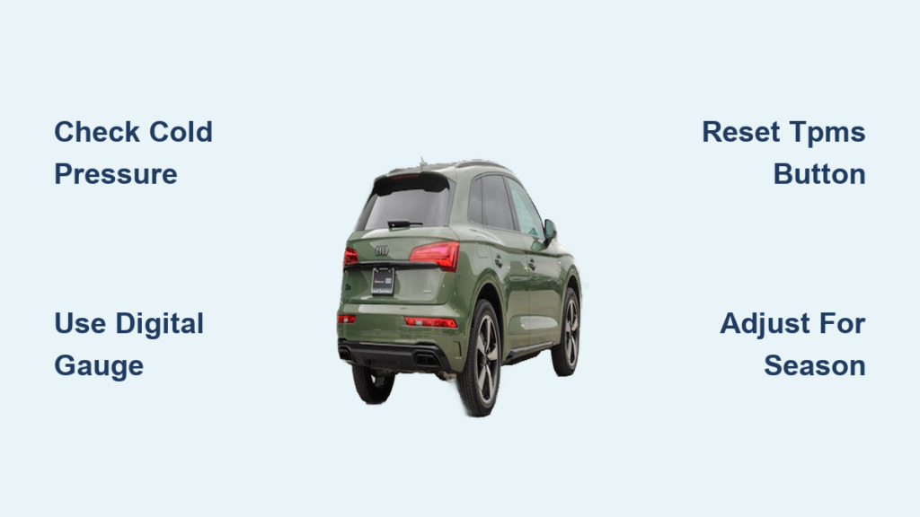 After tire rotation or replacement, always recalibrate the TPMS system. Failure to do so causes the system to monitor pressures against the wrong wheel positions, triggering false warnings. Some Q5 models require a special tool to activate sensors in their new positions—another scenario where Audi dealer service proves cost-effective despite higher initial expense.