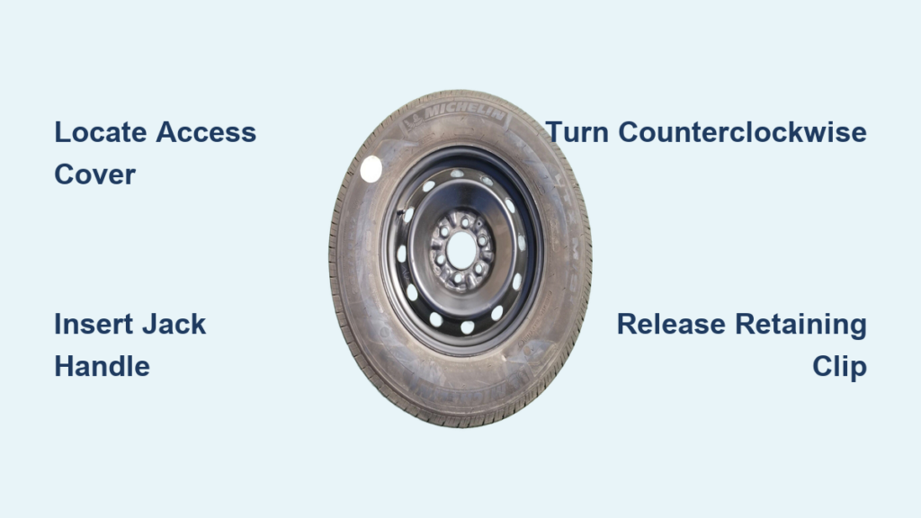 Once the spare tire rests on the ground, you’ll notice the winch handle turns more freely as the cable goes slack. This indicates it’s time to disconnect the tire from the winch assembly. Locate the retaining mechanism where the cable attaches to the spare—typically a flat metal bar secured by a spring-loaded clip or sliding latch.